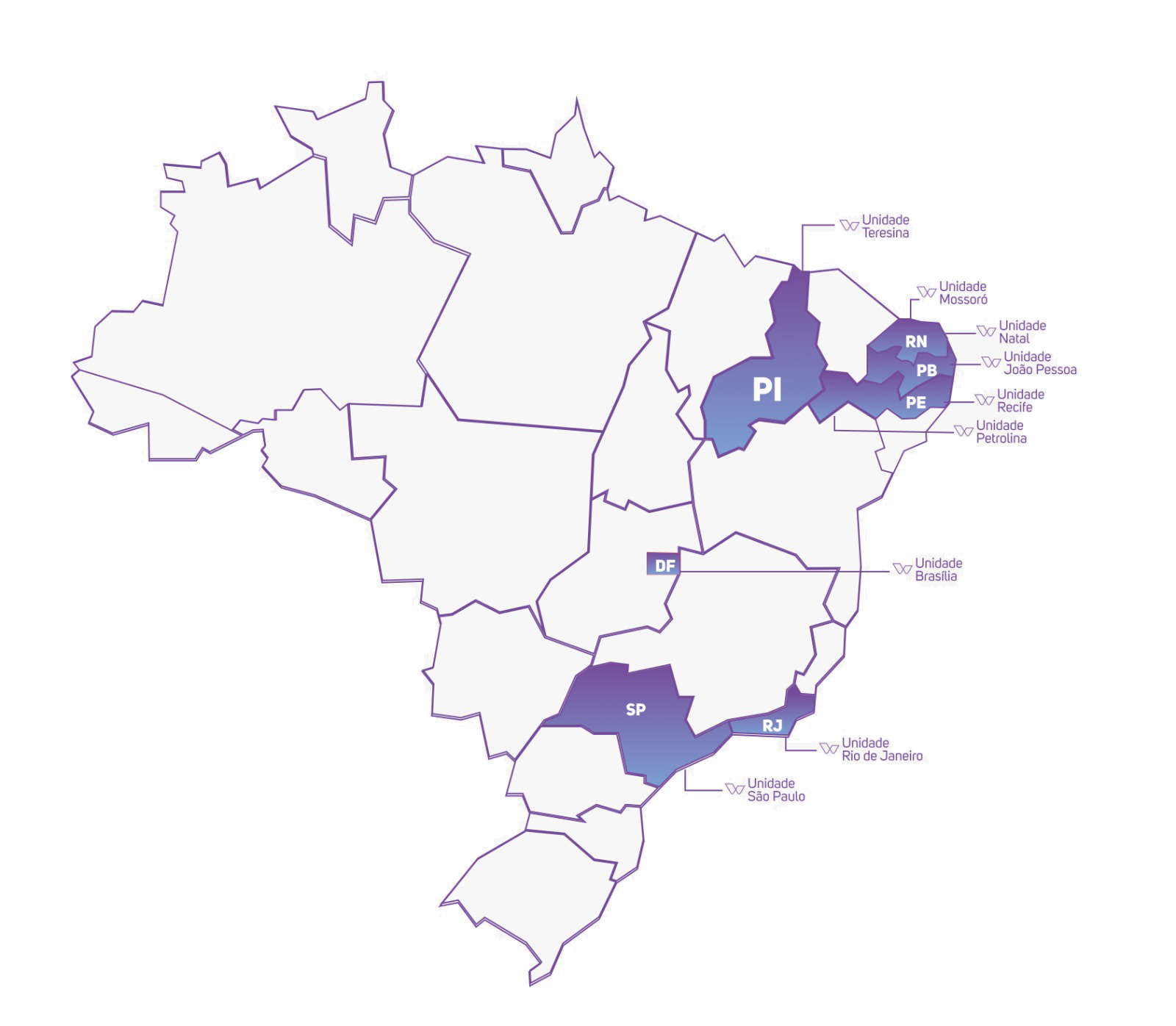 Atuamos em todo o território nacional, com sedes físicas em Recife, Natal, Rio de Janeiro, São Paulo, Brasília, Mossoró, João Pessoa, Teresina e Petrolina, além de atendimento remoto com equipe dedicada.